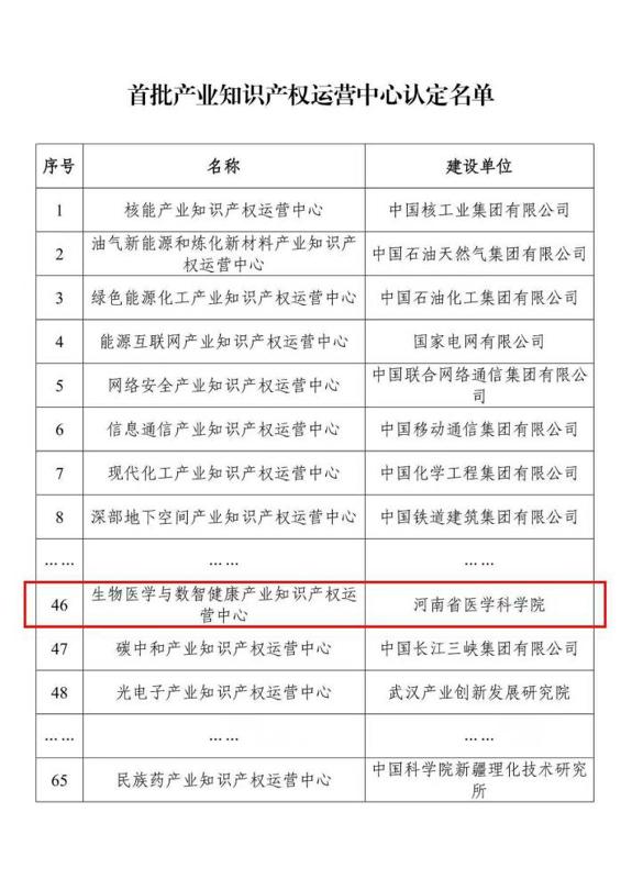 9月25日,国家知识产权局公示首批产业知识产权运营中心认定名单,河南省医学科学院成功入选,将承建“生物医学与数智健康产业知识产权运营中心”。这是我省深入贯彻落实知识产权强国建设纲要、强化知识产权全链条运营服务、推动产业高质量发展的重要成果,同时也标志着在生物医学与数智健康领域的创新实力获得认可。