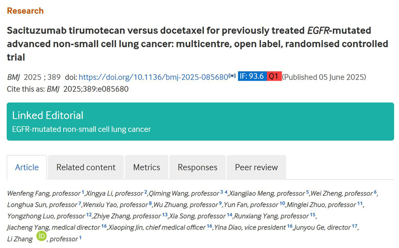 该研究由河南省医学科学院肿瘤研究所、河南省肺癌诊疗中心主任、河南省肿瘤医院肿瘤内科王启鸣教授团队,与中山大学肿瘤防治中心张力教授、方文峰教授等专家团队合作完成。该研究聚焦晚期EGFR突变非小细胞肺癌患者面临的后线治疗困境。这些患者在一线EGFR靶向药治疗和二线含铂化疗失败后,后续治疗选择极为有限,且耐药问题突出。研究首次证实,我国自主研发的抗体偶联药物芦康沙妥珠单抗(sac-TMT)疗效显著优于传统化疗方案多西他赛。这为解决上述难题提供了全新的精准治疗选择。王启鸣教授为文章共同第一作者。